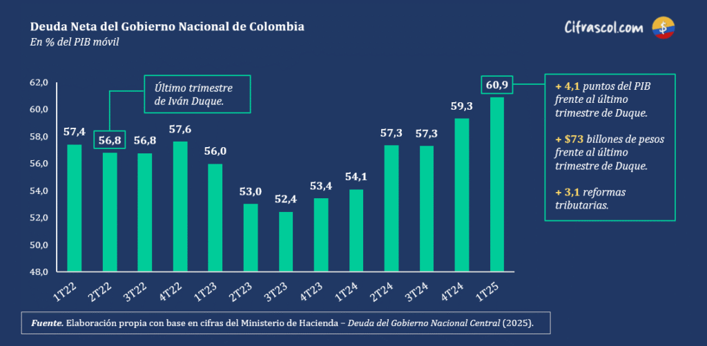 De acuerdo con las cifras recientemente publicadas por el Ministerio de Hacienda (enlace), la deuda neta del Gobierno Petro alcanzó el 60,9% del PIB, marcando un nuevo récord desde el año 2022 e incrementándose en 4,1 puntos del PIB ($73 billones de pesos de hoy o más de tres reformas tributarias) frente a lo heredado del Gobierno Duque.